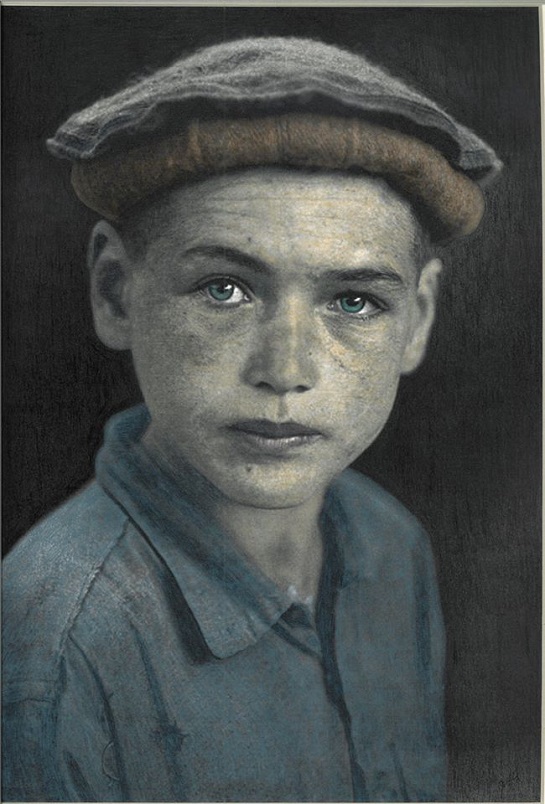 “Olhar de mil anos”, lápis-aguarela sobre cartolina. Corpo de poucas primaveras, mas um olhar de quem já viu muito. Olhar de angústia, olhar torturado de um rapaz que decerto nunca foi menino.