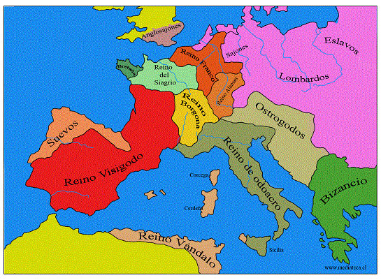 A começos do século V, o Império Romano de Ocidente experimentou uma grande instabilidade militar, económica e política. Desde o centro da Europa (especialmente desde o território da actual Alemanha), numerosos povos germânicos; suevos, saxões, francos, alanos e outros, começaram a atacar os postos fronteiriços romanos no rio Rhin, irrompendo finalmente no Império o 31 de Dezembro do ano 406 e assentando-se no seu interior pelas armas, mas também graças a pactos pacíficos.