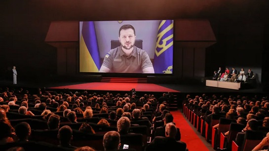 « L’intervention de Zelensky au festival cannois va de soi si vous regardez ça sous l’angle de ce qu’on appelle « la mise en scène » : un mauvais acteur, un comédien professionnel, sous l’œil d’autres professionnels de leurs propres professions.