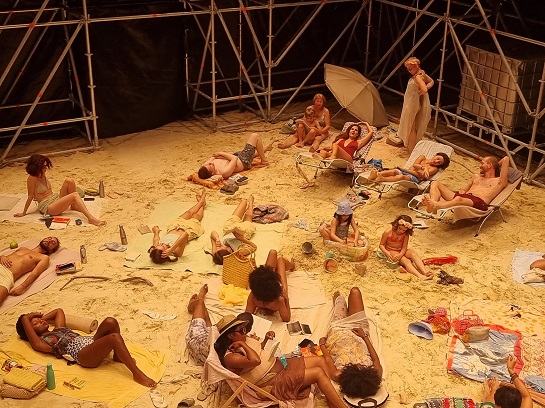 Em Sun&Sea, a praia é uma janela para a sociedade. Vemo-la de cima e são muitas janelas. Os pensamentos de praia que ocorrem aos veraneantes são umas tantas, a compor um libreto cantado. Ouve-se e vê-se desigualdade, frivolidade, indiferença, compromisso político, encantamentos, diversidade, os corpos a ocuparem-se gestos de afirmação. Os livros ou revistas que eles lêem, o que comem, como se deitam na praia, no que se deitam são outras tantas janelas.