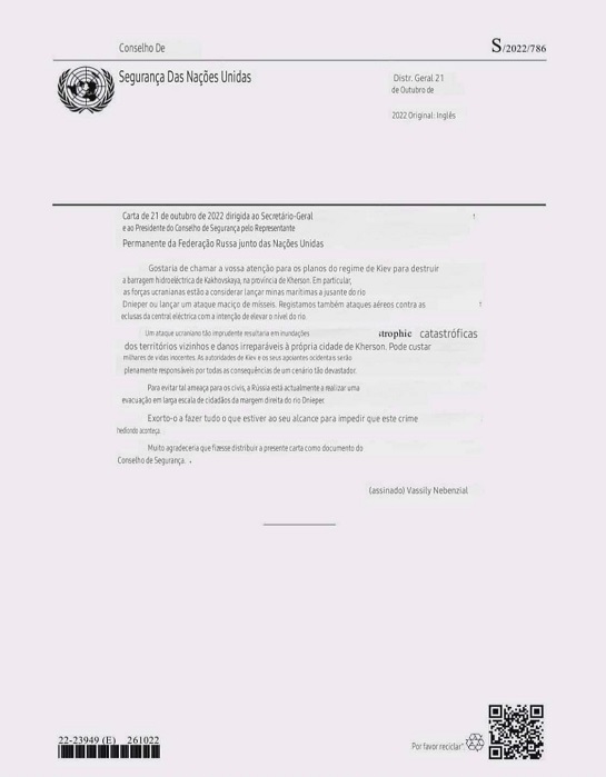 A barragem é há meses bombardeada, há relatórios disso e queixas à ONU, em baixo coloco a imagem da carta do Nevenzya à ONU de 21 de outubro de 2022 em que denuncia os sucessivos ataques à barragem e a colocação da segurança desta em causa. Fico na dúvida se os nossos líderes e comentadeiros acham que somos todos estupidos e ignorantes ou simplesmente gostam de nos fazer de palhacitos. Ah, entretanto já saíram os resultados sobre a investigação dos ataques à central nuclear de Zaporizhzhia? E a dos gasodutos? Não interessa não é? Pois está bem, aqui os palhacitos fingem que não entendem. Isto é mais do que indecente, é criminoso, é colocarem toda a população Europeia em risco e calarem-se, omitirem, metam o raio do Direito Internacional nos entrefolhos e o “quem invadiu quem?”, não sejam indecentes e criminosos, a Rússia no meio de toda a anormalidade são há anos os mais responsáveis, têm sido inúmeras as denúncias e avisos, tiveram mais do que motivos, foram acusados, espezinhados e humilhados décadas, sofreram sanções e no meio de toda a anormalidade são os únicos decentes que ainda por cima são acusados de propagandistas, ainda não ouvi uma mentira das entidades oficiais russas, nem uma, da Ucrânia até já perdi a conta a tanta aldrabice que nos espetaram, além disso, Putin tem uma paciência de Santo, os EUA por menos espetaram com duas bombas atómicas no Japão em 1945, já no fim da Guerra, mas estamos a falar de quê? Mas estes supostos intelectuais informados falam de quê? São maus? Não, são péssimos e indecentes, até a História alteram. Mas alguém no seu juízo perfeito acha que se fossem os EUA no lugar da Rússia já não tinham resolvido? Que a Ucrânia não estava já controlada e ocupada com milhões de mortos e a Europa caladinha? Que o Zé cocainado já não estava a jogar às cartas com os anjinhos? Só tolitos acreditam nas teorias de um bando de pacóvios pagos para entreterem a malta, mas o grave, o grave mesmo é mentirem a todo um povo que nem sequer tem noção para o que está a ser arrastado com as mentiras e irresponsabilidade desta gente, que não tarda vão todos ter de mandar os filhos e os netos para uma Guerra, isto se lá chegarem e não forem dizimados antes. A irresponsabilidade é atroz. Agradeçam a Putin a paciência de Santo e a decência que tem porque, outro no lugar dele já a tinha perdido, acho que até eu….
