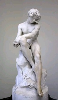 Sentado num rochedo, um jovem nu, belo e são, com as mãos cruzadas e apoiadas a um lado, costas arqueadas, cabeça pendente numa pose de abandono, com uma lágrima escorrendo-lhe pela face, olha tristemente? solitariamente? saudosamente? meditativamente? alheadamente? melancolicamente? desesperadamente? a espuma das ondas a seus pés.
