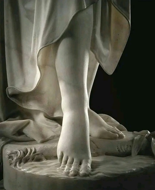 Toute la révolution de cette statue est contenue dans le geste du pied qui échappe aux modèles hellénistiques et introduit un nouveau mouvement et un nouveau point de contact entre le doigt et l’eau avec une grande puissance de marbre.