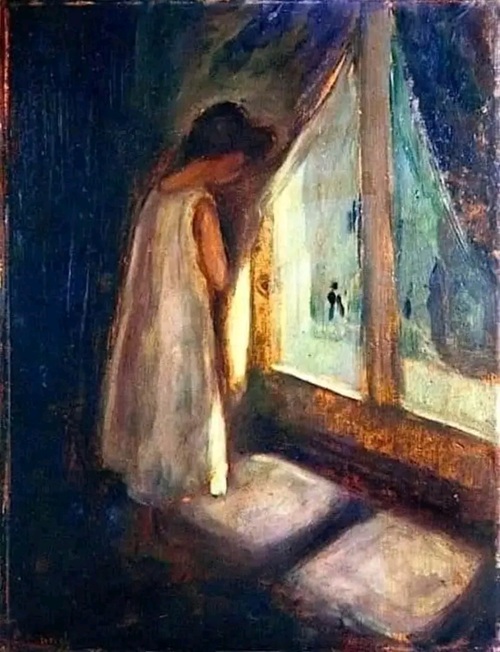 Elle est à moitié nue et tient le tissu qui touche sa jambe en train de tester la température de l’eau avec la pointe de son pied.