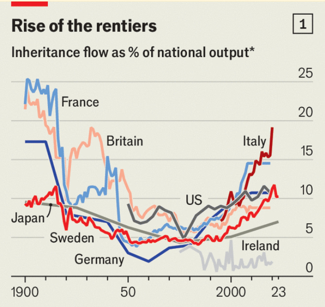 O fenómeno de transmissão de herança, com a parte transmissora ainda viva, tem aumentado e passa a ser um dos principais motores da perpetuação da desigualdade. O peso crescente das heranças desvalorizou o trabalho como forma de ascensão social e identificação de classe. Enquanto é nos mercados que a apreciação do património se faz, o resultado é o reforço dos acontecimentos à margem destes. As heranças, doações e empréstimos, fora da esfera dos mercados, ganham importância para explicar o funcionamento das sociedades.