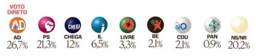 Se as eleições de 18 de maio se realizassem no próximo domingo, a AD venceria as eleições com 34,1% dos votos. O PS continuaria a ser a segunda força política mais votada com 27,1%, o Chega manteria a terceira posição, com 15,2% e a Iniciativa Liberal (IL) atingiria os 8,3%. Estes resultados da sondagem da Consulmark2 para o Nascer do SOL e a Euronews mostram que em relação à primeira quinzena de abril mantém-se o empate técnico entre as duas grandes forças políticas, já que a margem de erro é de 4,1%.