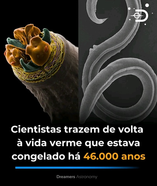 Continuar a lerFãs de Carl Sagan | “nematoide”, um tipo de verme microscópico. Após 46 mil anos congelado, revive. Voltou à vida – se movendo e até se alimentando. No rio Kolyma, Rússia.