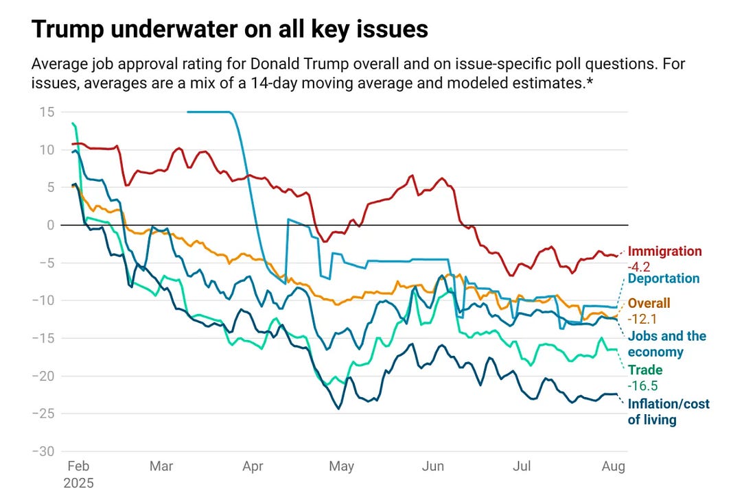 All of this takes place against a political background in which Trump faces massive public disapproval, not just overall but on every issue: