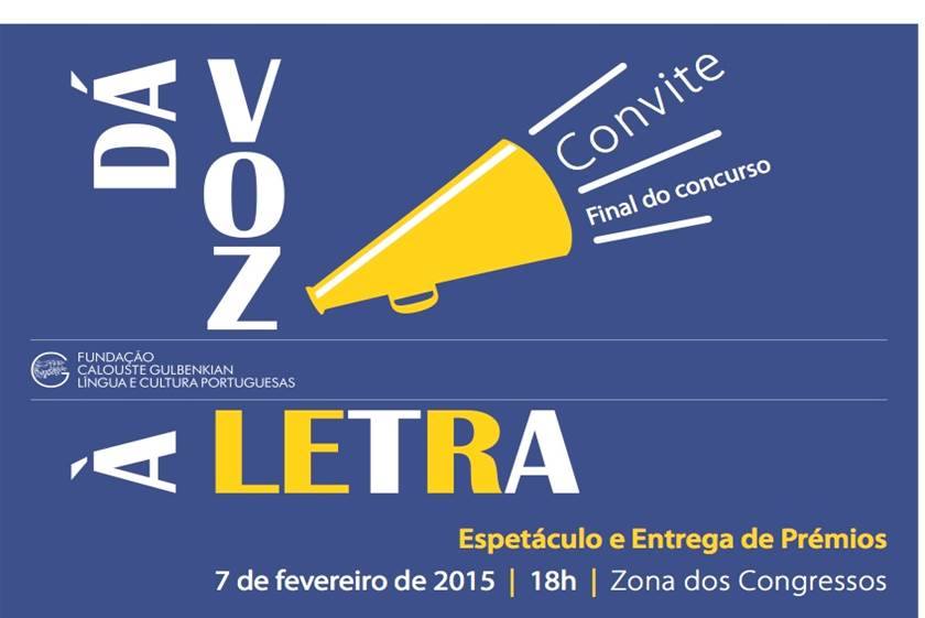 “DÁ VOZ À LETRA” É um Concurso. Vai ser um Espectáculo. São cinco raparigas e cinco rapazes, com idades entre os 13 e os 17 anos. Fixem estes nomes: a ANA TERESA, a MARIA ADELAIDE, a MARIA CAROLINA, a MATILDE, a RITA, o ANTÓNIO MIGUEL, o DANIEL, o DUARTE, o JOÃO, o PEDRO – a lerem em voz alta, para o público, textos da Literatura Portuguesa . São os finalistas, os dez magníficos. O Júri, nesta final, é composto por CATARINA FURTADO, ALBANO JERÓNIMO e DAVID MACHADO. Será anunciado o nome da (do) melhor leitora (leitor) de 2015.