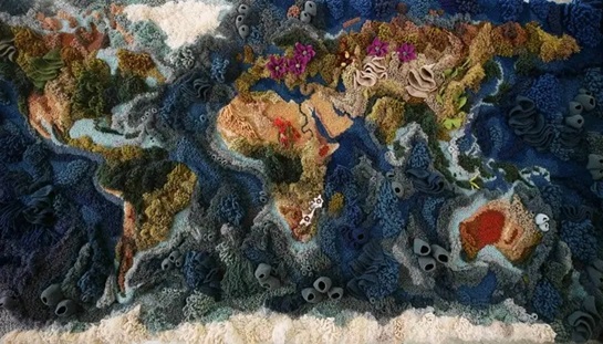 Vanessa Barragão é uma Artista de Tapeçarias que apelam à consciência ecológica do mundo. Exemplo da sua internacionalização é a gigantesca tapeçaria do mapa-mundo, Botanical Tapestry, exposta no aeroporto de Heathrow, Londres. Retirado do Facebook | Mural de Maria Helena Manaia.