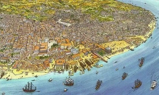 «Para começar apresento a ilustração de Luís Diferr sobre Lisboa antes do Terramoto…