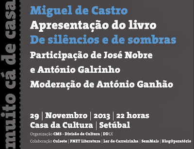 Esta sexta, 29 de Novembro, no muito cá de casa, é apresentado o livro De Silêncios e de Sombras do poeta Miguel de Castro. Os atores José Nobre e António Galrinho vão ler poemas deste livro e a moderação é do António Ganhão.