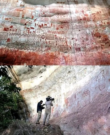 Sabia dessa? 🐘🌿 Arqueólogos fizeram uma descoberta inacreditável no coração da Amazônia: um mural pré-histórico com quase 13 mil anos, cobrindo mais de 12 quilômetros de rochas com desenhos da Era do Gelo! 🖐️🎨
