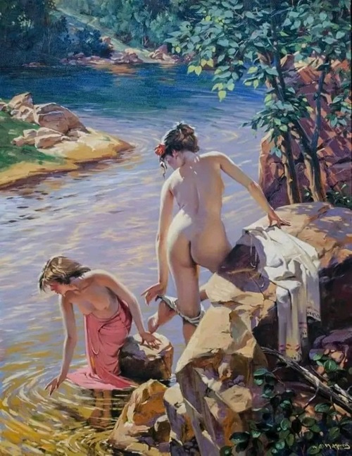 Artist Felix Mas is best known for his “sensual elegance” as he captures idealized visions of femininity in his oil paintings and graphic works. Calling himself a traditionalist, his women are luminous and fresh, finding inspiration in Asian culture. Felix’s work appears to be deeply influenced by Japanese woodblock prints, the fashions of India, and the historical grace of Egypt, Rome, and Greece. Mas was born in 1934 in Barcelona.