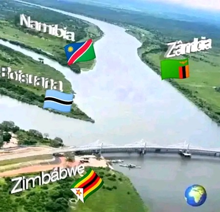 Fronteira entre Namíbia 🇳🇦, Botsuana 🇧🇼, Zimbabué 🇿🇼 e Zâmbia 🇿🇲