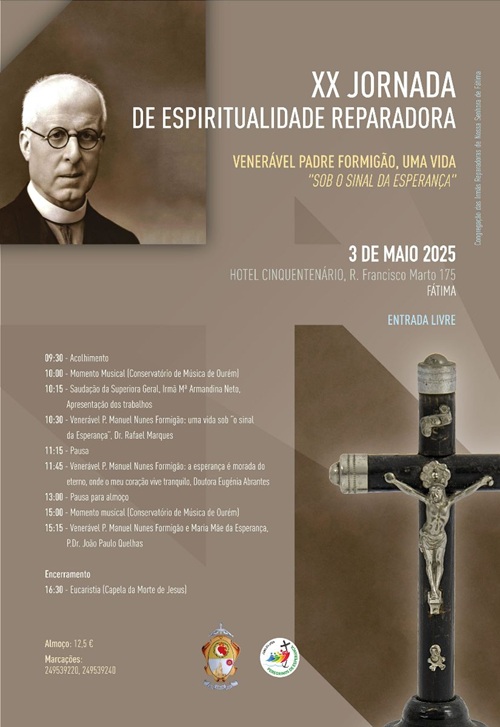 A 3 de maio, sábado, terá lugar na Cova da Iria/Fátima a XX Jornada de Espiritualidade Reparadora. A caminho do centenário da sua fundação como congregação religiosa feminina, que será celebrado a 6 de janeiro 2026, a Jornada de Espiritualidade Reparadora é organizada e promovida pelas Irmãs Reparadoras de Nossa Senhora de Fátima (IRNSF).