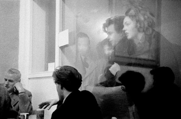 In 1964 The Beatles starred in the feature film A Hard Day’s Night. Blurring the lines between the reality of their pop-star status and fiction, the film follows several days in the life of the group as they navigate television appearances and record label executives. Coming at the height of ‘Beatlemania’ the screaming fans depicted in the film were mirrored by the hoards of fanatic young girls that would await the band at all of their public appearances. David Hurn, following a tradition of Magnum photographers working on film sets, took this photograph of fans eyeing Ringo Starr on the moving train, where the film was primarily shot.
