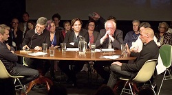 Reunião da Internacional Progressista com Ada Colau no centro, Bernie Sanders a sua esquerda e Yanis Varoufakis de perfil.