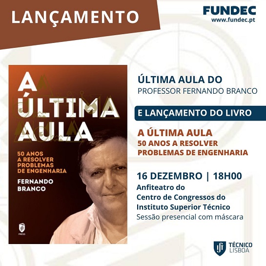 A Última Aula do Professor Fernando Branco, Distinguished Professor do Instituto Superior Técnico (IST),  irá realizar-se no próximo dia 16 de Dezembro, às 18h00, no Grande Auditório do Centro de Congressos do Departamento de Engenharia Civil, Arquitectura e Georrecursos do IST.