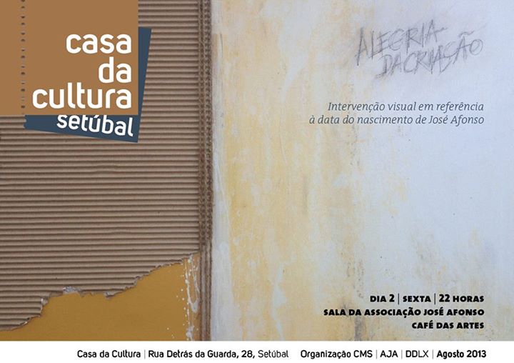 Na Associação José Afonso, na Casa da Cultura de Setúbal, houve a “Alegria da Criação”. Uma iniciativa do José Teófilo Duarte em forma de dinamização cultural de um espaço, em jeito de uma instalação de pintura, uma palestra, um debate, um convívio… uma intervenção visual e o inesperado do “working in progress”. A verdadeira alegria da criação. Uma iniciativa que visa comemorar o 84º aniversário do nascimento de José Afonso.