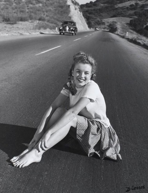 Fotografia feita em novembro de 1945 mostra Marilyn Monroe, aos 19 anos, sentada no meio da Pacific Coast Highway, Califórnia, Estados Unidos. Foi o primeiro ensaio da futura diva e atriz Marilyn Monroe. Na fotografia, Marilyn sorri para o fotógrafo André de Dienes, com que viveria um breve romance. “Conforme os minutos passavam, eu me apaixonava mais e mais por Norma Jeane [verdadeiro nome de Marilyn Monroe]”, relata André de Dienes no livro “André de Dienes, Marilyn” — publicado pela Taschen.Fotografia: André de Dienes