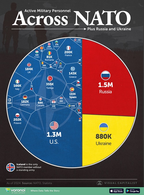 Como se vê nesta figura (colhida AQUI), mesmo sem os EUA, o Canadá e a Turquia, a Nato europeia tem mais tropas do que a Rússia, apesar de esta estar mobilizada para a guerra na Ucrânia há três anos; e, como mostrei anteriomente (AQUI), também tem uma despesa militar superior.