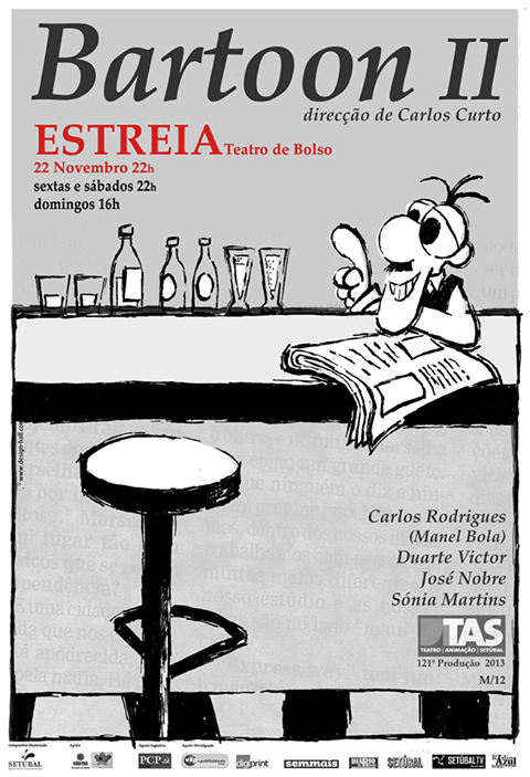 1474620_10153475025030058_892240375_nO TAS-Teatro Animação de Setúbal, vai estrear na próxima sexta-feira dia 22 de Novembro às 22:00, a sua 122ª produção – Bartoon II, no renovado Teatro de Bolso. Bartoon II é um original de Carlos Curto, escrito sobre as tiras diárias de Luís Afonso publicadas no jornal Público.