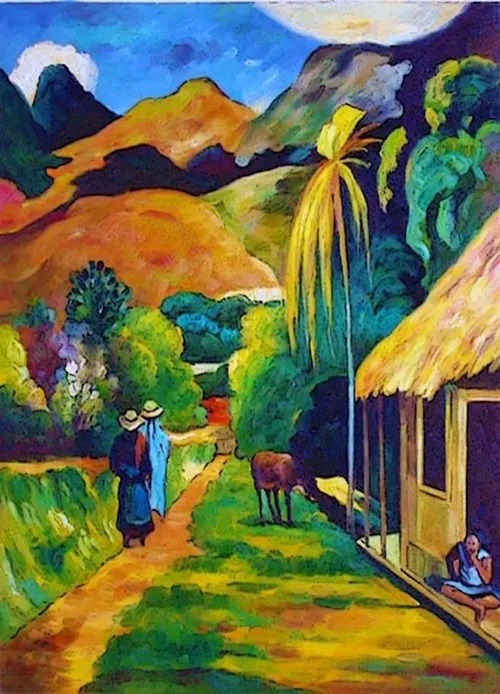 “An angel with yellow wings points out to two Tahitian women Mary and Jesus, also Tahitians. Nudes dressed in pareos, a kind of flowered cotton cloth which is worn as one likes around the waist. The background [is] of very somber mountains and trees in flower. A dark purple road and green foreground; to the left some bananas. I am rather pleased with it.”